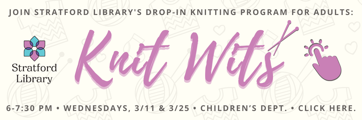 Home Join Knit Wits, our drop-in knitting and crochet program for adults! Knit Wits meets alternating Wednesdays: 3/11 and 3/25. Teens: uCreate Video Game Club meets from 3 to 4:30 pm on Thursday, 2/12 and Friday, 3/27. Click here for details. Big changes are coming to Stratford Library! Click here for construction updates. Introducing the Children’s Department’s Library of Things! Click here to explore. Click here for this month’s uCreate Space Open Hours and to request a reservation.