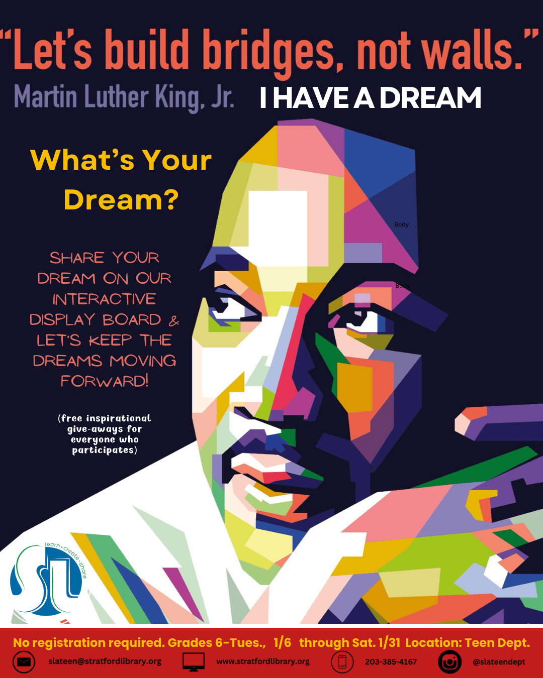 Check out our MLK Jr Display & Giveaways plus 1/14 is National Dress Up Your Pet Day! By Teen Librarian on January 13, 2026 in Teen Click here for more information.