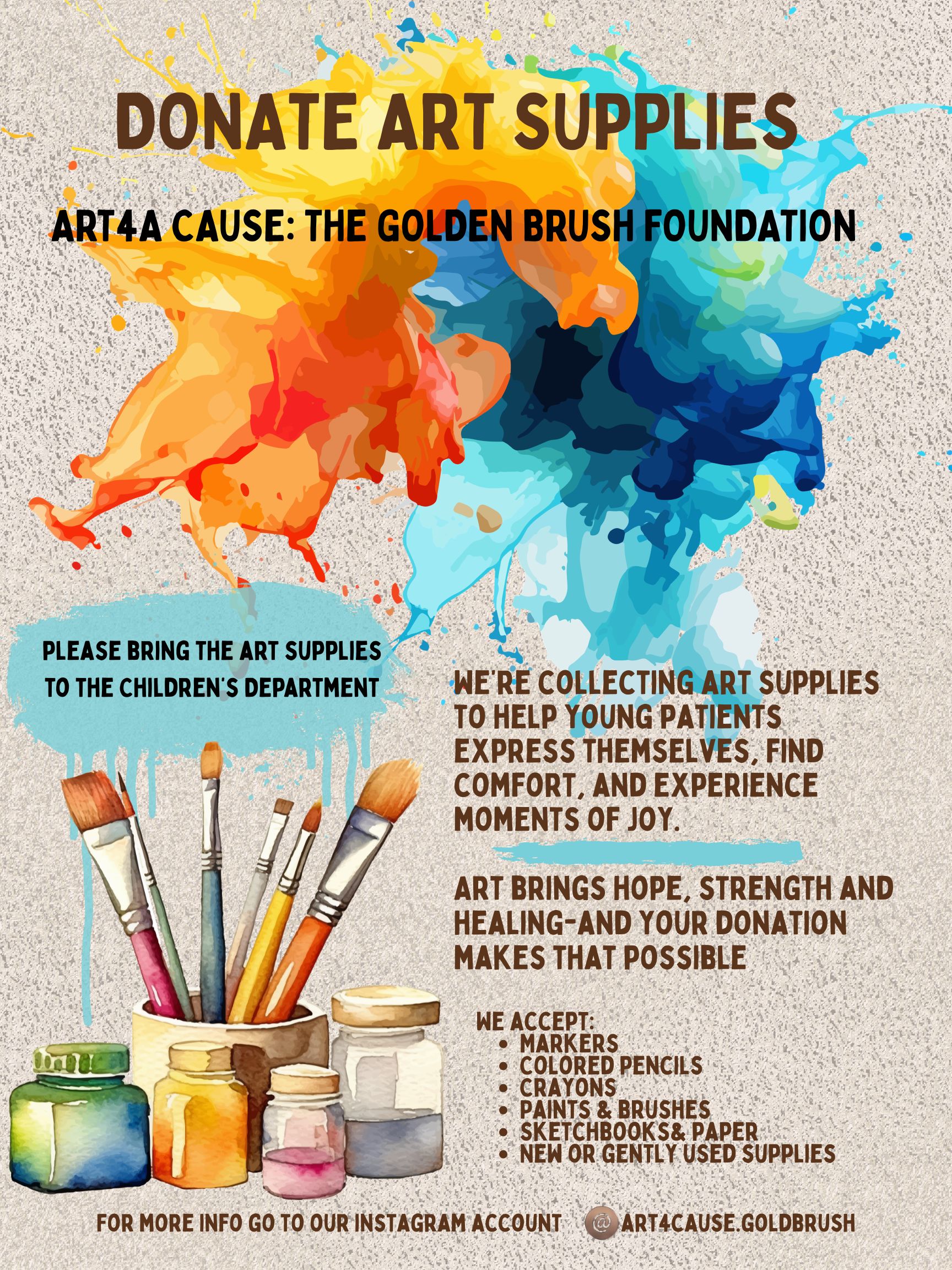 Donate Art Supplies to ART4A Cause please bring the art supplies to the children’s department. Arts 4 Cause